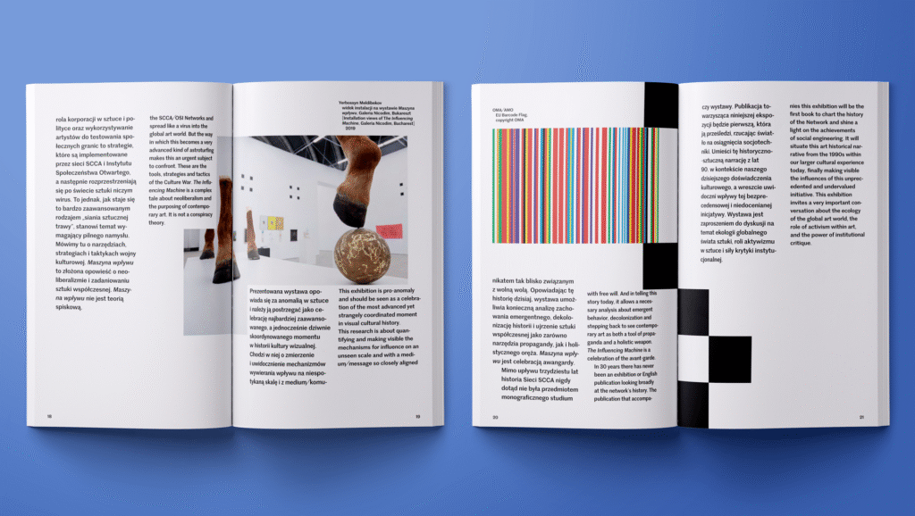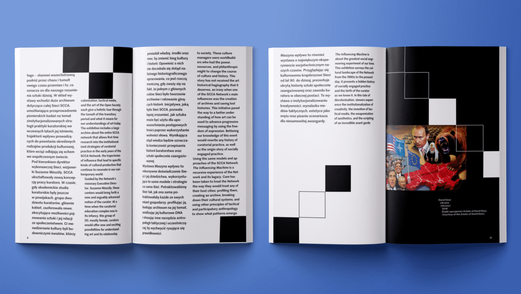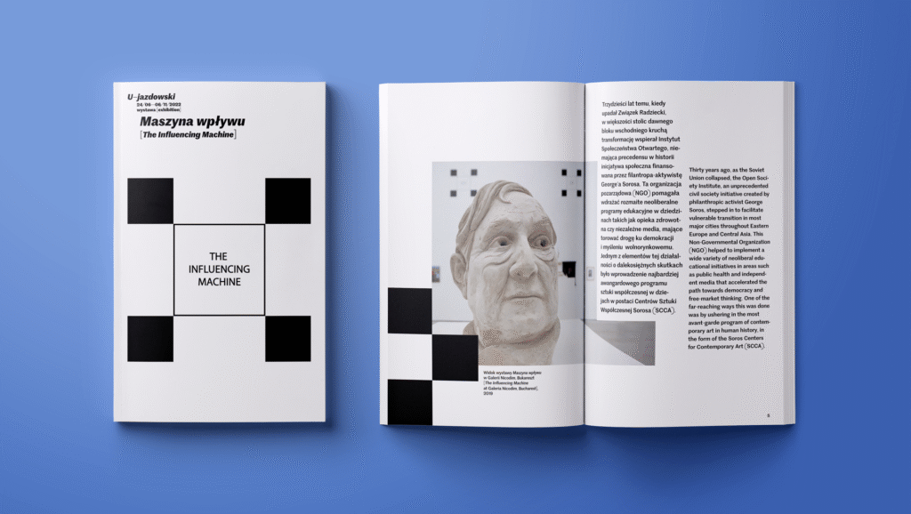 Layout broszury „Maszyna wpływu” towarzyszącej wystawie o tym samym tytule. Założeniem projektowym było zaprojektowanie rozkładówek w oparciu o kreatywne rozwinięcie charakterystycznego logo zbudowanego z czterech kwadratów.