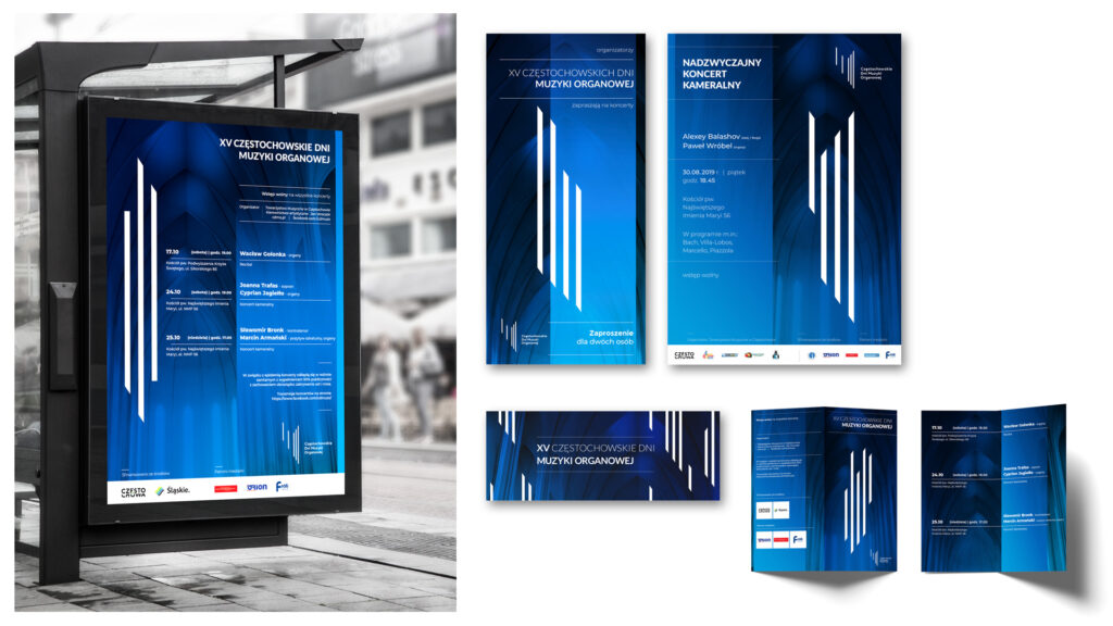 Identyfikacja wizualna dla Częstochowskich Dni Muzyki Organowej. Szata graficzna zaprojektowana jest w oparciu o wertykalne, podłużne figury geometryczne, nawiązujące do kształtu piszczałek organowych. Różne konfiguracje tych figur wyrażają harmoniczne relacje dźwięków w muzyce. Powagę i sakralny charakter muzyki organowej uwydatnia skonfrontowane z kształtem sklepień gotyckich ciemnogranatowe tło. Wertykalizm kompozycji podkreśla zarówno strukturę instrumentu, jak i transcendentny wymiar tej formy sztuki – prowadzi wzrok „ku górze”.