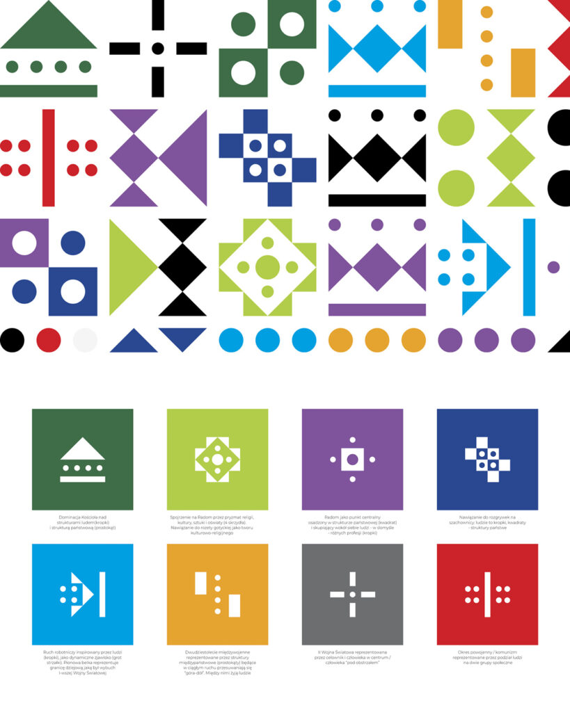 Projekt piktogramów w systemowej formule pozwolił na tworzenie wzorów identyfikujących poszczególne epoki. Jednocześnie powstał uniwersalny, wielobarwny pattern, w którym piktogramy z różnych epok się przenikają – wykorzystywany głównie w komunikacji marketingowej jako najbardziej rozpoznawalny motyw.