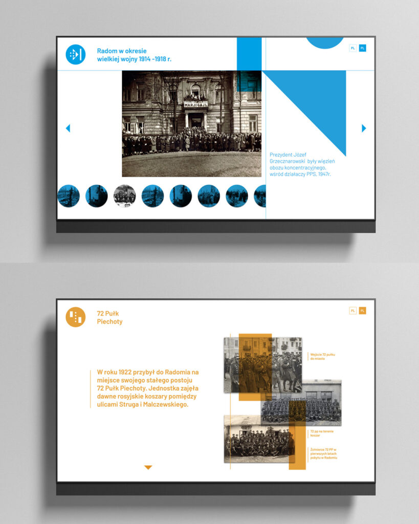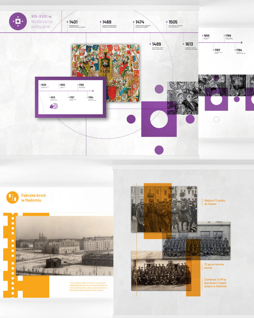 Projekt identyfikacji wizualnej dla Muzeum Historii Radomia. Wystawa obejmuje szeroki przekrój historyczny, dlatego naturalnym rozwiązaniem było stworzenie key visualu, który nie tylko buduje tożsamość ekspozycji, ale również wspiera nawigację po muzeum. Kluczowe elementy identyfikacji to: