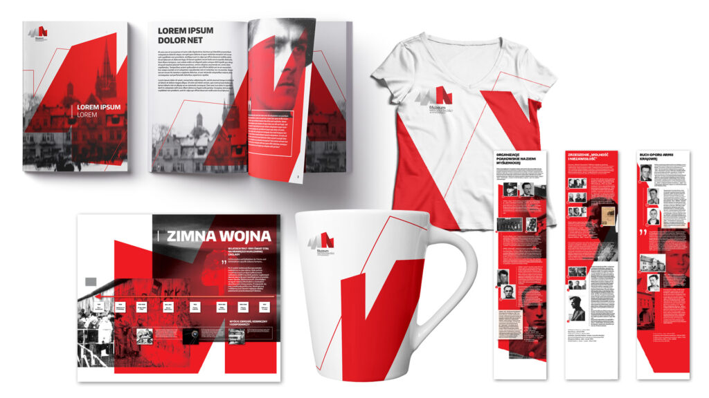 Projekt Identyfikacji Wizualnej dla Muzeum Niepodległości w Myślenicach. Warstwa graficzna w kreatywny sposób nawiązuje do dostarczonego przez Klienta logo. Dynamiczny przebieg linii skośnej reprezentuje burzliwy bieg historii – zarówno lokalnej, jak i całego kraju. Kolorystyka biało-czerwona bezpośrednio odwołuje się do barw narodowych, podkreślając patriotyczny charakter instytucji.