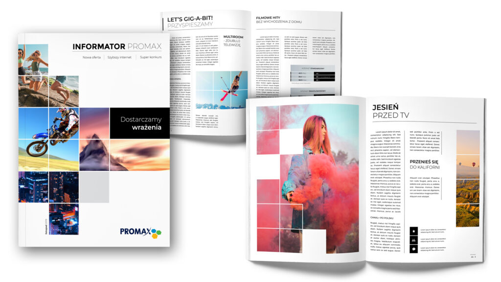 Layout dla branżowego magazynu dla dostawcy internetu światłowodowego i telewizji Promax. Założeniem projektowym dla opracowania layout’u było odtworzenie efektu dostępu do treści różnego rodzaju. Zastosowany został efekt kwadratowych okienek przez które w „podglądać” można różnego rodzaju przestrzenie wizualne, w domyśle różne kanały telewizyjne.