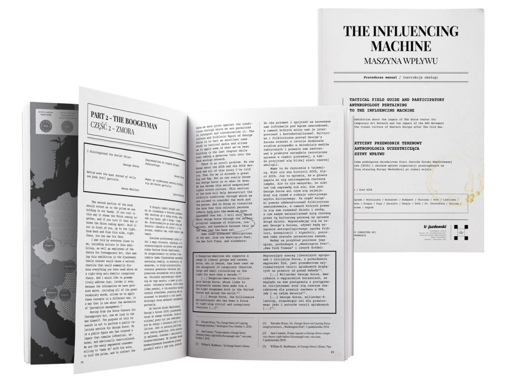 „Punktem wyjścia dla projektu Maszyna wpływu była prawdziwa historia Centrów Sztuki Współczesnej Sorosa (Soros Centers of Contemporary Art, SCCA), sieci dwudziestu instytucji sztuki współczesnej, które pojawiły się nagle w krajach dawnego bloku komunistycznego na początku lat 90., gdy skończyła się zimna wojna. Centra Sztuki Współczesnej Sorosa działały krótko, ale radykalnie zmieniły wyobrażenie o tym, do czego można wykorzystywać sztuki wizualne i kulturę. Ich intencją było wprowadzenie zmian w sposobach myślenia społeczeństw.” (…)